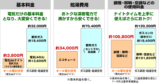 各電力会社のオール電化契約を利用する事により、ガスよりも大幅に光熱費を削減させます。安い深夜電力を上手に使ってとってもおトク!太陽光発電を利用すると年間光熱費が数千円に!?