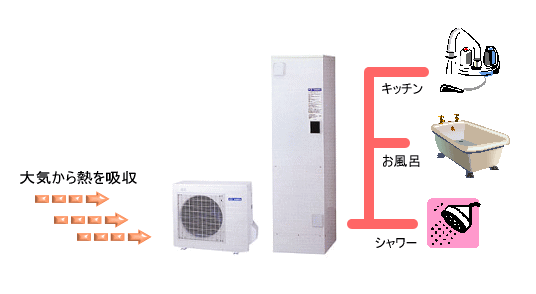 簡単に言うと、大気の熱を利用してお湯を創る設備、それが「エコキュート」です。 大気から熱を吸収して、その熱を利用してお湯を沸かすシステムです。燃焼しないから、 排気がなくクリーン、しかも高いエネルギー効率を得られます。